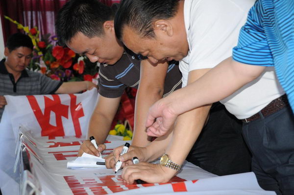 集團(tuán)公司領(lǐng)導(dǎo)及管理人員在安全宣傳標(biāo)語上簽名 |